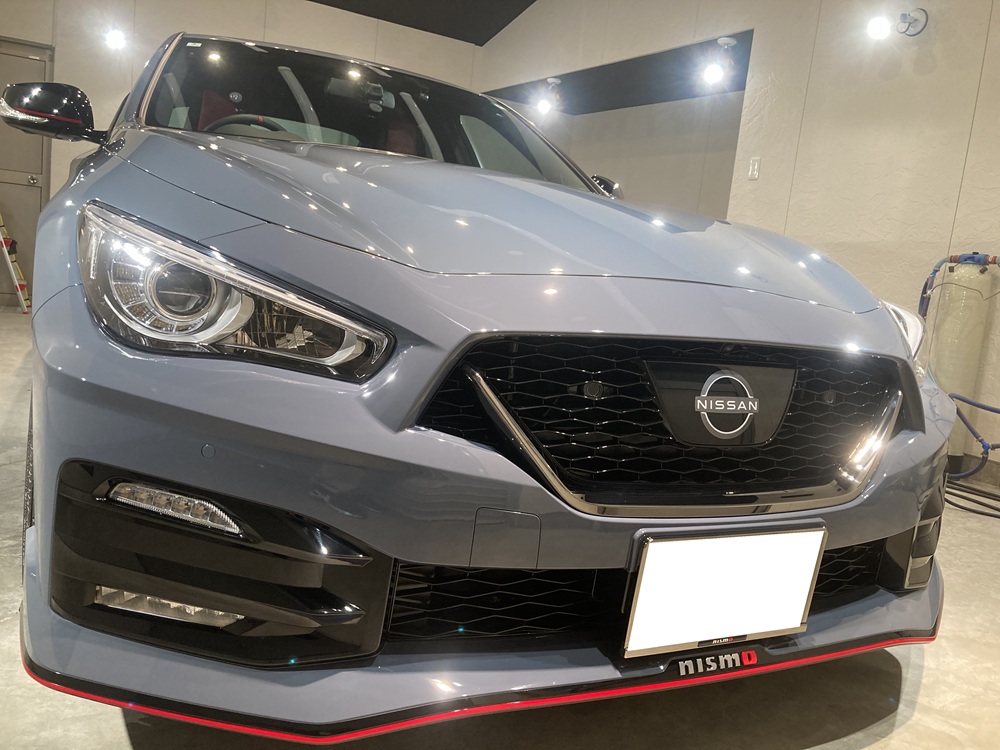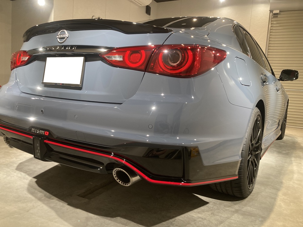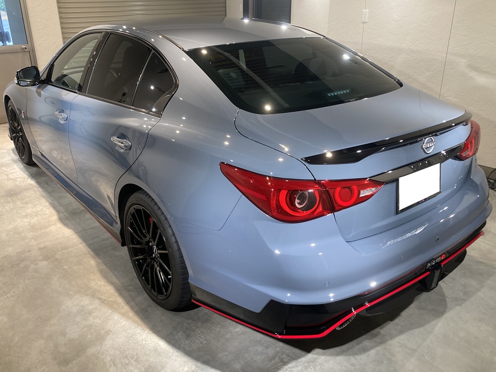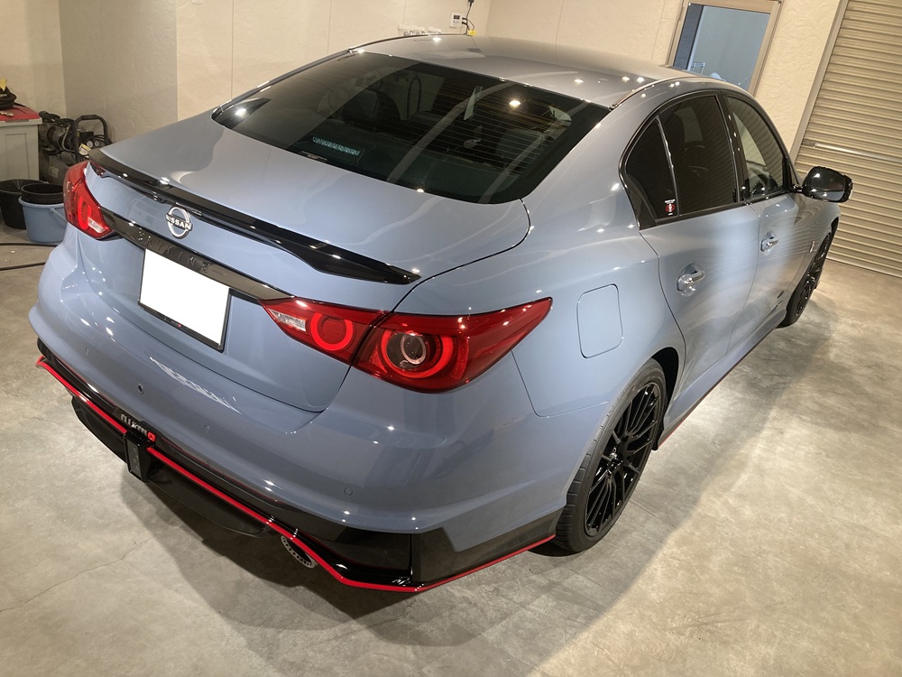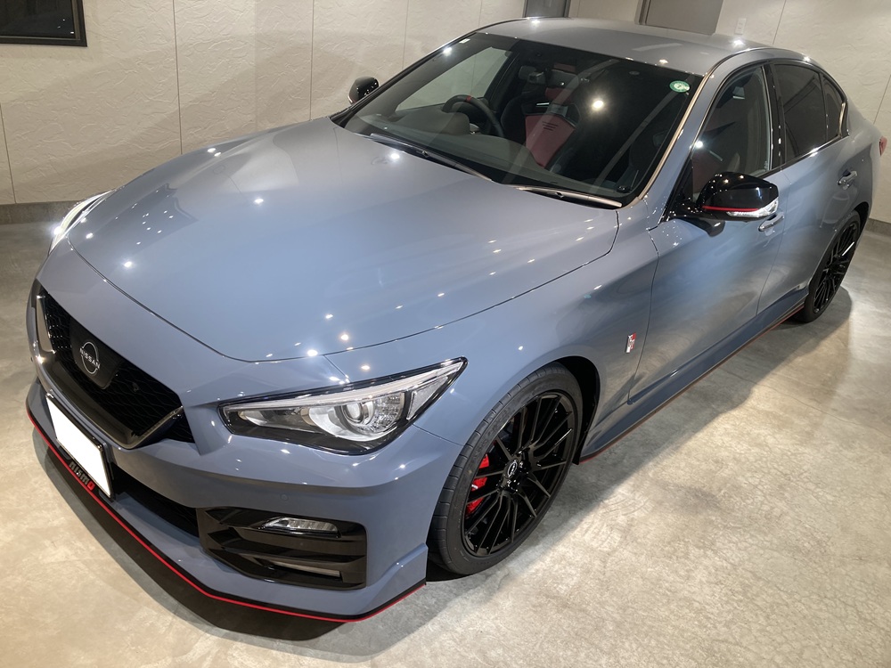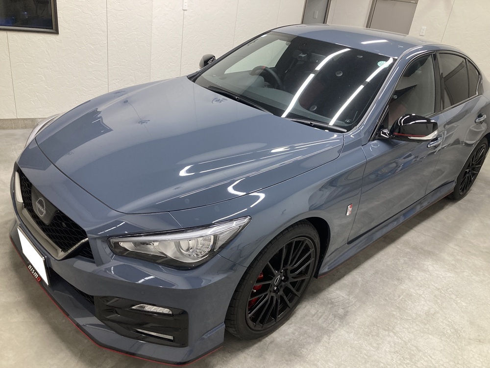 ニッサン、スカイラインNISMO、グレーの新車にグロスアーマーの湿式施工版であるウル艶デュアルコートをご用命いただきました。